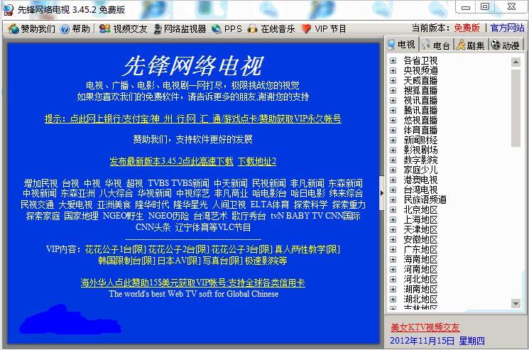 先鋒網(wǎng)絡(luò)電視是最注重節(jié)目質(zhì)量的免費(fèi)衛(wèi)星電視軟件版,專用服務(wù)器提供熱點(diǎn)影視,節(jié)目收看率極高通過(guò)獨(dú)特的合作資源,先鋒網(wǎng)絡(luò)電視免費(fèi)版提供超過(guò)500套超高清晰的衛(wèi)星電視節(jié)目,亞洲高清臺(tái)[開(kāi)獎(jiǎng)],本港臺(tái)直播,翡翠電影臺(tái)、高清翡翠臺(tái)、翡翠劇集臺(tái)、東森新聞、CHC高清電影、CHC動(dòng)作影院、星空衛(wèi)視、中天新聞、中天綜合、中天亞洲、鳳凰香港臺(tái)、鳳凰中文、TVB系列,民視無(wú)線 探索世界,探索科技,探索人文 探索調(diào)查 ESPN高清 NBA高清 中天綜合高清 HBO高清 翡翠臺(tái) 東森電影高清 衛(wèi)視電影高清 AXN電影高清,高清翡翠臺(tái) 翡翠電影臺(tái) 亞洲高清臺(tái) 東森洋片高清 東森綜合高清 緯來(lái)電影高清 中天娛樂(lè)高清 高清影院 東森新聞 三立新聞 TVBS新聞 本港開(kāi)獎(jiǎng)臺(tái) 衛(wèi)視體育臺(tái) 衛(wèi)視體育臺(tái)灣 香港有線體育臺(tái) 英超直播 廣東體育 NBA直播 勁爆體育 超級(jí)足球頻道 歐洲足球 ESPN亞洲 ESPN臺(tái)灣 香港有線NBA 中超直播1.2臺(tái) TVB翡翠臺(tái) 臺(tái)灣中視 中天綜合 臺(tái)灣華視 臺(tái)灣臺(tái)視 鳳凰衛(wèi)視 國(guó)家地理高速 迪士尼卡通國(guó)內(nèi)中央及各省衛(wèi)星電視節(jié)目等全球著名電視節(jié)目