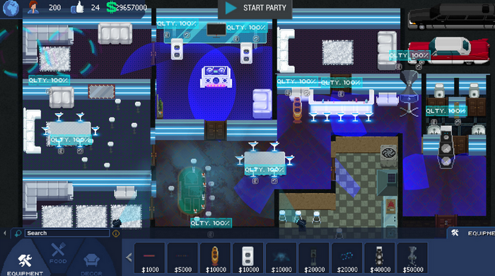 《瘋狂派對大亨(Party Hard Tycoon)》是由Pinokl Games制作,tinyBuild發(fā)行的一款策略模擬類游戲,游戲中玩家將搖身一變成為一家夜店的老板,玩家需要通過不斷的經(jīng)營讓自己的夜店生意越來越好,作為年輕人的娛樂場所,夜店中一定要有一些能夠吸引年輕人的東西,不過就和其他任何生意一樣,想經(jīng)營好一家夜店也不是一件容易的事情。除了設(shè)計(jì)好夜店中的元素之外,還會遇到許許多多不同的突發(fā)狀況,如何處理這些突發(fā)狀況也將影響到夜店生意的好壞。