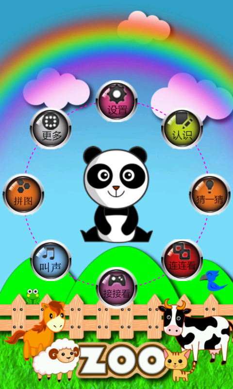 1.認識:通過高清圖卡認識各種動物,中文和英文童聲朗讀功能,幫助學說話,在主頁“設(shè)置”里更改;長按圖片,可以語音復讀;聲音可以開關(guān)控制。