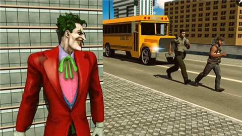 小丑Joker帶你走進驚險刺激的犯罪世界,高清3D游戲世界,自由的犯罪之旅在街角隱藏自己的身影,偷襲路過的警察,在城市中制造恐怖襲擊,襲擊校車,攻擊前來救援的警察,