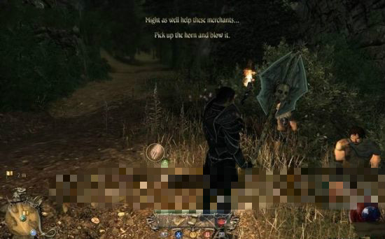 主角從草叢里拾起號(hào)角,吹響了它,然后上前給三名商人松梆。