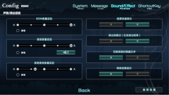 3D音效故事全篇在音效上采用了人頭錄音,在文字游戲中鮮少有公司使用這種錄音方式。此種音效是在錄制的時(shí)候采用了特殊的錄音方式,達(dá)到了雙聲道耳機(jī)也能體會(huì)7.1聲道效果的突破。缺點(diǎn)也是普通音響聽(tīng)不出效果,7.1聲道的音響。推薦耳機(jī)欣賞。順便一提,電影院都是7.1聲效,當(dāng)然硬件上也是配合7.1聲效的8聲道揚(yáng)聲器。