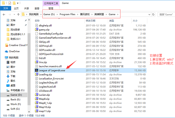 3. 如果任然無法使用,請將上面的 [7.進(jìn)入游戲之前檢查] 【英雄聯(lián)盟\Game\League of Legends.exe】 右鍵鼠標(biāo) - 屬性 - 兼容性 (如果有)取消勾選 【高 DPI 時禁用顯示縮放】