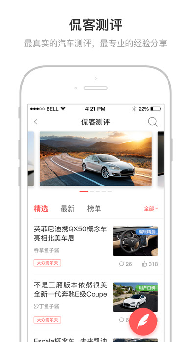 1. 汽車資訊 - 每時(shí)每刻,隨時(shí)隨地,輕松掌握全球的汽車資訊報(bào)道。2. 侃客測評(píng) - 與資深汽車專家,車迷,或者是對(duì)汽車感興趣的人,分享和探討關(guān)于汽車的一切。