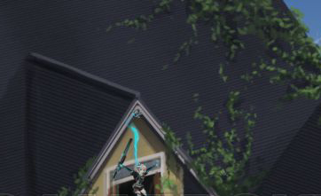 進(jìn)入小鎮(zhèn)后,向右前進(jìn)至一個(gè)斜著的房子處。