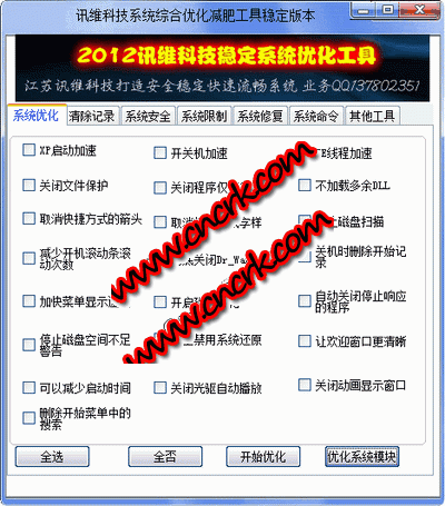 2012系統(tǒng)綜合優(yōu)化減肥軟件 主要是為了網(wǎng)管而寫的當(dāng)然家庭用戶想達(dá)到網(wǎng)吧的機(jī)器運(yùn)行速度也可以使用的,此軟件功能強(qiáng)大集成了很多功能 1,系統(tǒng)綜合優(yōu)化2,系統(tǒng)深刻清除LJ3,系統(tǒng)安全防范4,綜合限制5,系統(tǒng)常見(jiàn)問(wèn)題修復(fù)6,DOS常用命令7,系統(tǒng)綜合設(shè)置8,OEM信息修改9,IE信息修改與美化10,進(jìn)程管理11.開(kāi)始菜單設(shè)置12.系統(tǒng)綜合信息修改與版權(quán)修改13.設(shè)置用戶登錄與讀取登錄密碼