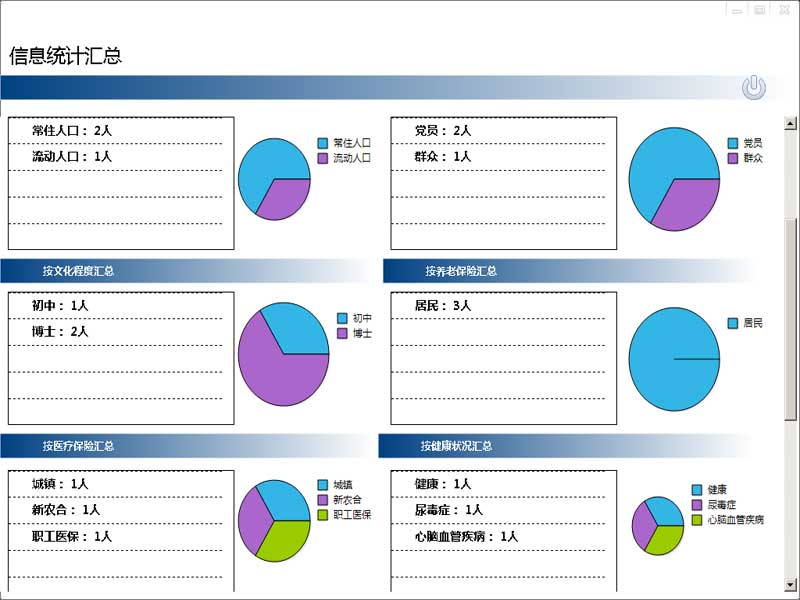 3 人口信息管理:對人口的基本信息、工作信息、社保信息、計生信息等,進(jìn)行了全方位的管理,自動生成信息報表和分類統(tǒng)計圖。