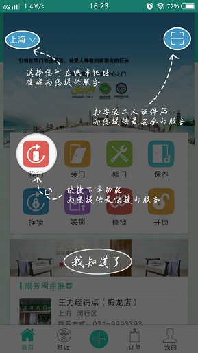 1、在線下單,及時為您分配修理師傅,上門為您解決煩惱,告別“牛皮癬”小廣告。2、自助服務(wù),您可以通過視頻以及問答知識自己掌握修門換鎖技能,“撩妹”“顧家”必備技能哦!