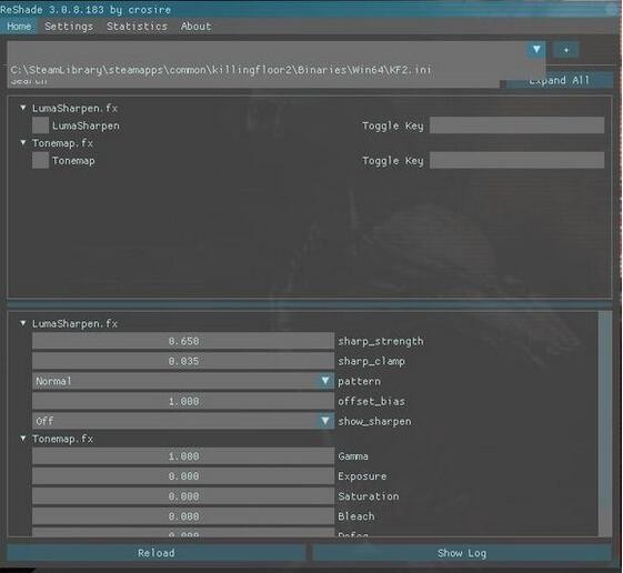下拉并選擇KF2.ini,LumaSharpen和Tonemap前面的方框可開啟或關(guān)閉特效,窗口下方還可以設(shè)置參數(shù)進(jìn)行微調(diào)