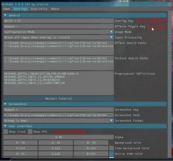 運(yùn)行ReShade_Setup_3.0.8.exe, selete game ,選擇 kfgame.exe,勾選 direct 10+模式,接著彈出一個窗口,選擇”是“,下載完畢后,僅勾選LumaSharpen.fx 和 Tonemap.fx ,點(diǎn)OK,安裝完畢。接著把壓縮包里的 KF2..ini 放在 KFGame.exe 所在的目錄下 ,然后進(jìn)入游戲,shift+f2 打開設(shè)置界面 。在home標(biāo)簽下,根據(jù)提示進(jìn)行設(shè)置,最后會出現(xiàn)如下界面