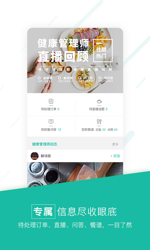 筷子健康A(chǔ)PP以健康管理師知識(shí)分享為中心,健康管理師之間可以進(jìn)行行業(yè)間的專業(yè)互動(dòng),平臺(tái)不定期舉辦健康管理師論壇活動(dòng),促進(jìn)行業(yè)發(fā)展,同時(shí)建立與用戶進(jìn)行一對(duì)一專業(yè)服務(wù)后臺(tái)。 我們提供的功能包括但不限于: 健康管理師可看到屬于自己的待處理訂單、待直播話題、待回復(fù)問答,實(shí)施跟蹤解決;發(fā)布健康膳食食譜,實(shí)時(shí)與用戶互動(dòng)等等。【更新日志】