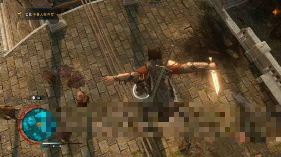 在外墻飄飾移動(dòng)到半獸人指揮官頭頂?shù)睦K索上,落到繩索后,再繼而對(duì)指揮官施展空中暗殺。