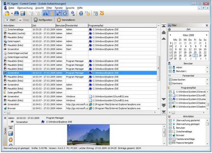 PC Agent破解版是一款系統(tǒng)監(jiān)控軟件,PC Agent破解版能默默的記錄在你機器上發(fā)生的一切,軟件完全后臺運行,并且將記錄保存在壓縮并加密過的日志里,日志支持關(guān)鍵字搜索,可以被自動發(fā)送到網(wǎng)絡(luò)上的某個共享資源中,或者發(fā)送到一個預(yù)先設(shè)定好的電子郵箱中。