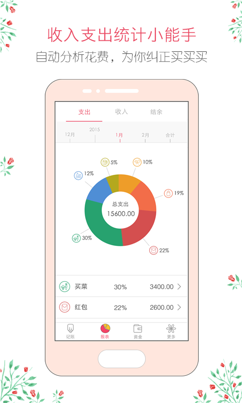 4、每月支出明細(xì)圖表,收入明細(xì)圖表和收支結(jié)余明細(xì)圖表直觀的向您展示了您每月的資金流向脫離月光族,從“記”開(kāi)始