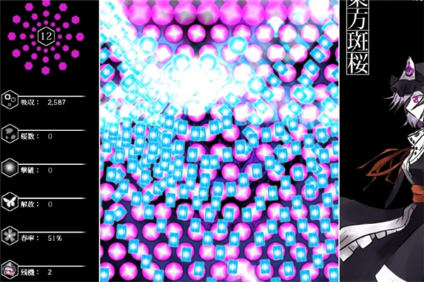 《東方斑櫻》是一款由日本獨(dú)立工作室制作發(fā)行的飛行射擊類游戲,這是一款超炫的彈幕游戲,也是《斑巫女》的續(xù)作,與之前的體驗(yàn)版一樣,該作使用了斑鳩系統(tǒng)的彈幕STG,不過不太相同的是,這一款作品更注重于直接吸收,也可以說是一種“STG方式的解密”。游戲主角西行寺幽幽子,她在黑白兩色之間與敵人戰(zhàn)斗,快節(jié)奏的模式讓你雙手顫抖!【游戲玩法】