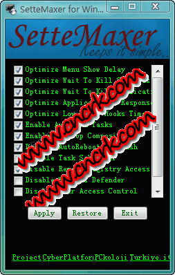 SetteMaxer V1.0.0 英文綠色免費版 SetteMaxer是個很小的系統(tǒng)優(yōu)化實用工具,專為Windows 7設計。它可以幫助用戶解決在優(yōu)化Windows 7時遇到的小問題,用戶只需點擊幾下鼠標就行,再不需要操作注冊表和系統(tǒng)服務,它提供了最為常見的、相對安全的優(yōu)化選項,包括優(yōu)化菜單延遲顯示、快速關閉進程、禁用Windows Defender、禁用UAC等等。為你節(jié)省時間
