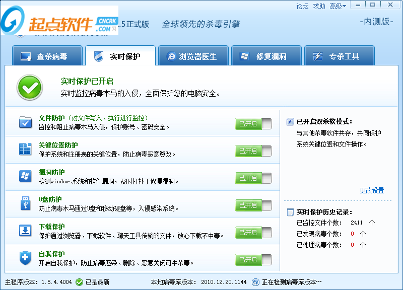 1.實(shí)時(shí)保護(hù)雙殺軟模式,完美兼容傳統(tǒng)殺毒軟件,多加一個(gè)殺軟更安全2.快速檢測(cè)系統(tǒng)、軟件漏洞,及時(shí)提醒智能修復(fù),從根源上關(guān)閉病毒入侵的大門(mén)