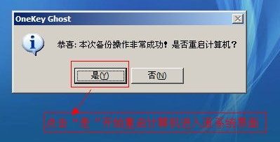 6、藍(lán)色進(jìn)度條走完后,會提示你備份系統(tǒng)成功,點擊“是”可重啟計算機(jī)進(jìn)入原系統(tǒng)桌面