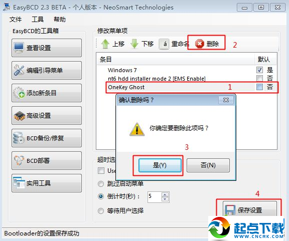 5、然后鼠標(biāo)左鍵點擊要刪除的引導(dǎo)項,如OneKey Ghost,點擊【刪除】,彈出提示框,點擊是確認(rèn)刪除,最后保存設(shè)置;