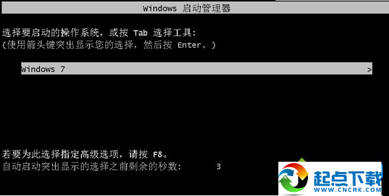 7、重啟系統(tǒng)進(jìn)入啟動菜單,這時候就只有Windows7一個啟動菜單了。
