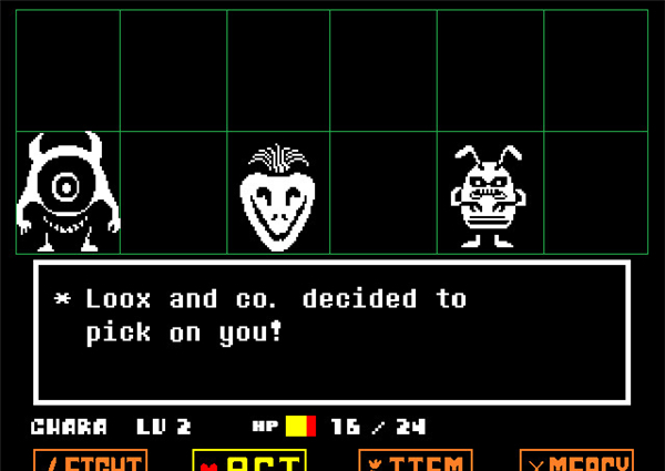 戰(zhàn)斗方框:如果敵人選擇攻擊你(不論你是否選擇主動(dòng)攻擊),在屏幕下方會(huì)出現(xiàn)一個(gè)方框,玩家操控這個(gè)心形對(duì)方框的圖案進(jìn)行躲避,一旦被觸碰就會(huì)受到傷害,某類(lèi)特殊圖案即便是觸碰了也不會(huì)受到傷害(如骷髏的藍(lán)光)。