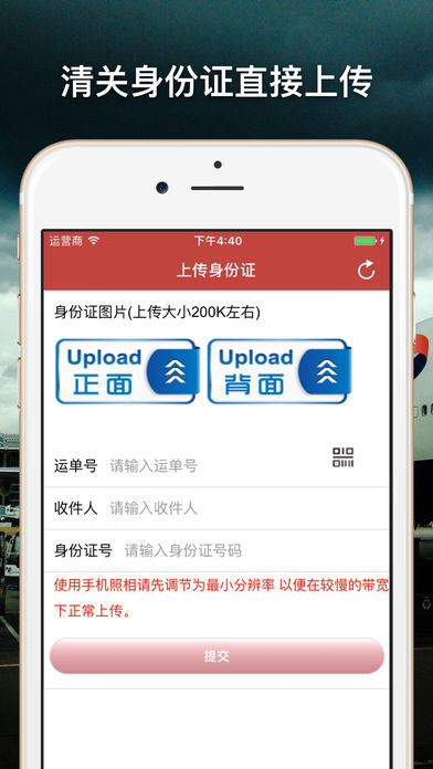 海關(guān)身份證文件上傳:內(nèi)置海關(guān)身份證文件上傳頁面讓你上傳所需文件更方便。