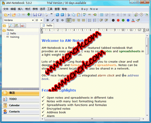 AM-Notebook [AM-記事本]是一個(gè)優(yōu)秀的任務(wù)欄增強(qiáng)工具.它提供有保存筆記便箋,計(jì)劃列表以及其他數(shù)據(jù)的功能.該軟件的另一個(gè)不錯(cuò)的功能是集成有鬧鐘提醒功能,這使您再也不會(huì)忘記重要的事務(wù)和約會(huì)了.而且更為體貼的是AM-Notebook [AM-記事本]不使用注冊(cè)表,同時(shí)在您編輯的時(shí)候AM-Notebook [AM-記事本]也會(huì)根據(jù)您的設(shè)置為每個(gè)文件作好備份