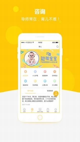 咨詢——專(zhuān)業(yè)的育兒導(dǎo)師問(wèn)答平臺(tái)。以問(wèn)答咨詢和在線計(jì)時(shí)咨詢兩種模式,幫助用戶解答育兒難題。內(nèi)容涵蓋健康保障、成長(zhǎng)保障和安全保障三大模塊。百科——定期更新的育兒干貨分享。為寶爸寶媽們提供育兒指導(dǎo)。內(nèi)容涵蓋了生長(zhǎng)發(fā)育、帶娃技巧、寶寶用品、寶寶喂養(yǎng)、寶寶護(hù)理、疫苗接種、親子早教、寶寶疾病8個(gè)模塊。