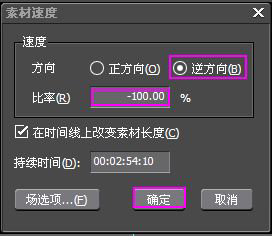那么接下來就制作視頻倒放效果,選中素材,右鍵 — 時(shí)間效果 — 速度,或者直接按快捷鍵Alt+E,然后會(huì)彈出速度的對話框,選擇逆方向,這時(shí)你就會(huì)發(fā)現(xiàn)速度變?yōu)樨?fù)數(shù)了,而且還可以通過調(diào)節(jié)數(shù)值來改變播放速度的快慢哦,感興趣的朋友可以試試。確定之后再預(yù)覽就會(huì)發(fā)現(xiàn)視頻已經(jīng)是倒著播放了,還是蠻好玩的嘛!