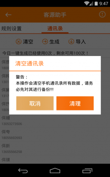 客源助手基于全國15億手機用戶基礎(chǔ)上的數(shù)據(jù)庫營銷輔助工具,自定義城市和號碼段的號碼智能生成算法,一鍵生成、一鍵導(dǎo)入,在最短時間完成精準粉絲的導(dǎo)入,最快的時間打造營銷人脈基礎(chǔ),支持任何支持導(dǎo)入聯(lián)系人的主流社交營銷應(yīng)用。提供聯(lián)系人數(shù)據(jù)庫營銷輔助功能,讓營銷工作基于海量手機潛在營銷用戶的數(shù)據(jù)庫基礎(chǔ)上開展,一鍵導(dǎo)入聯(lián)系人,完全自定義城市和號碼段,是打造精準營銷以及o2o客源的有力輔助工具。