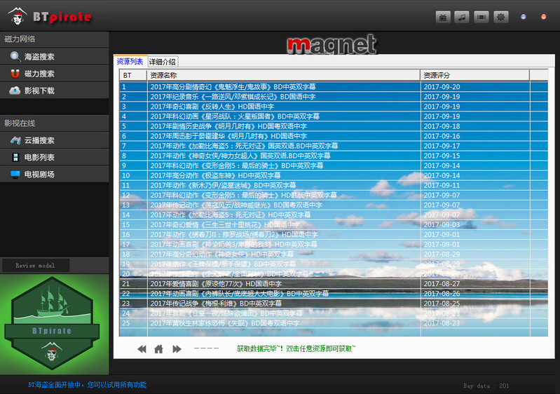 BT海盜搜索工具(BTpirate)集磁力引擎與海灣引擎于一體,是一款功能強(qiáng)大資源搜索器。BT海盜搜索工具采用API技術(shù)與海量云端暗網(wǎng)數(shù)據(jù)同步,不僅僅可以搜索到磁力網(wǎng)絡(luò),還可以搜索到更多可以直接在線播放的資源以及采用二次封裝的VIP點(diǎn)播內(nèi)容。【使用方法】