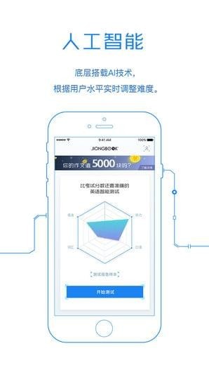 “JIONGBOOK”是一款由第三方獨立開發(fā)的,針對于檢測中國學(xué)生英語水平的免費測評軟件。JIONGBOOK通過大數(shù)據(jù)和人工智能技術(shù),使得用戶可以快速檢測出聽力、口語、寫作、詞匯和語法各項英語能力,及時了解英語學(xué)習(xí)的薄弱項。同時也會為用戶提供精準(zhǔn)英語能力數(shù)據(jù)分析報告,用戶可以將檢測成績換算成國內(nèi)外權(quán)威考試的分?jǐn)?shù),滿足用戶對于英語水平多角度了解、比較、學(xué)習(xí)的需求。【功能介紹】
