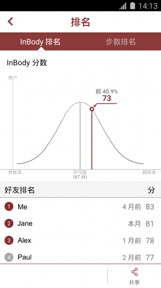 根據(jù)最近一周的步行數(shù)和InBody分?jǐn)?shù)排名。排名可顯示會(huì)員和手機(jī)通訊錄人員的排名情況。
