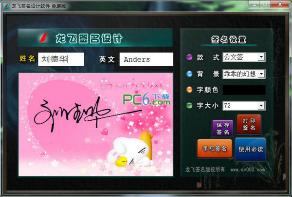 龍飛簽名設(shè)計(jì)軟件是一款前所未有的簽名設(shè)計(jì)軟件,是目前最好的簽名設(shè)計(jì)軟件,只要你輸入你的姓名,軟件立即生成你的簽名