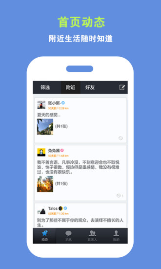 首頁動(dòng)態(tài),附近生活隨時(shí)知道。分類選擇,讓動(dòng)態(tài)更好瀏覽。