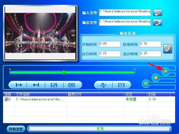 單擊下方“播放”小圖標,試行導(dǎo)入視頻,無誤,此時能看到“齒輪”圖標由灰色變藍,單擊可進入更改選項,確認轉(zhuǎn)換屬性后,確定返回,然后單擊“斜雙箭頭”如下圖: