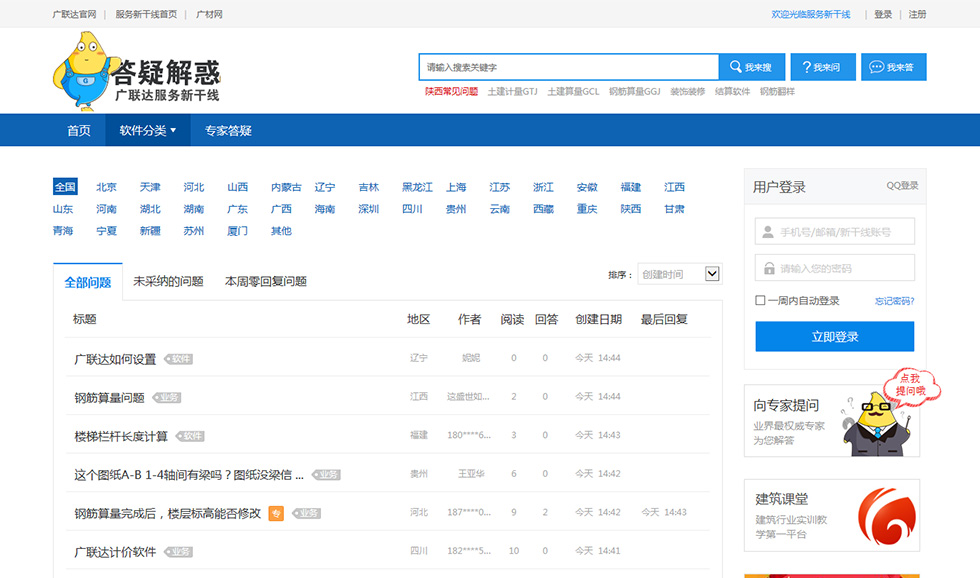 答疑解惑每天在線專家500多位,聚合了10年200萬條問題庫,建筑同行人軟件/業(yè)務(wù)問題你問我答的交流平臺(tái)
