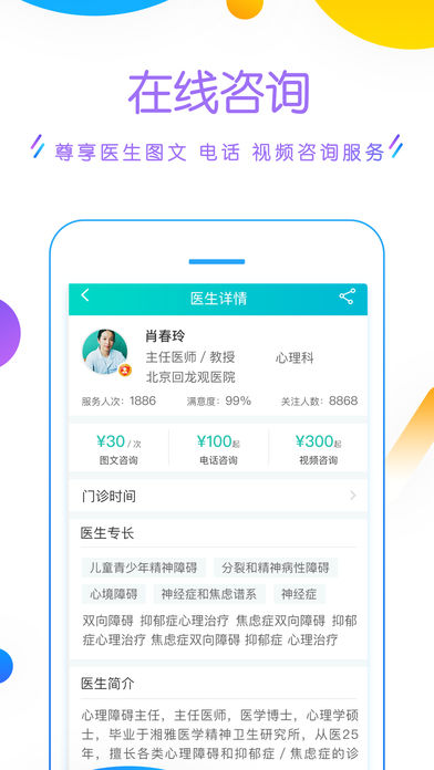 “好心情”移動醫(yī)療服務平臺是國內(nèi)唯一專注于精神和心理領域的專業(yè)移動醫(yī)療平臺,致力于成為精神心理領域互聯(lián)網(wǎng)醫(yī)療企業(yè)的領導者,平臺秉承 “有你,就有好心情”的核心價值理念,成為2萬名精神心理醫(yī)療專家的執(zhí)業(yè)平臺,同時服務中國1.6億精神和心理健康需求的用戶,整合優(yōu)質(zhì)醫(yī)療資源通過互聯(lián)網(wǎng)技術連接服務,助推中國人的“精神健康”。【軟件特點】