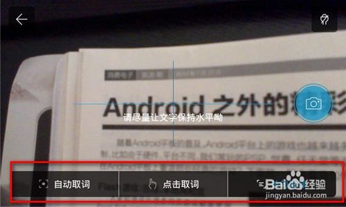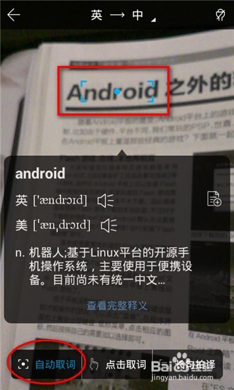點(diǎn)擊剛才下方的【拍照】按鈕可以切換進(jìn)入拍照取詞的相機(jī)界面,可以通過(guò)【自動(dòng)取詞】、【點(diǎn)擊取詞】、【長(zhǎng)句拍譯】等幾個(gè)功能來(lái)直接對(duì)書(shū)本、雜志上面的單詞或句子進(jìn)行翻譯。