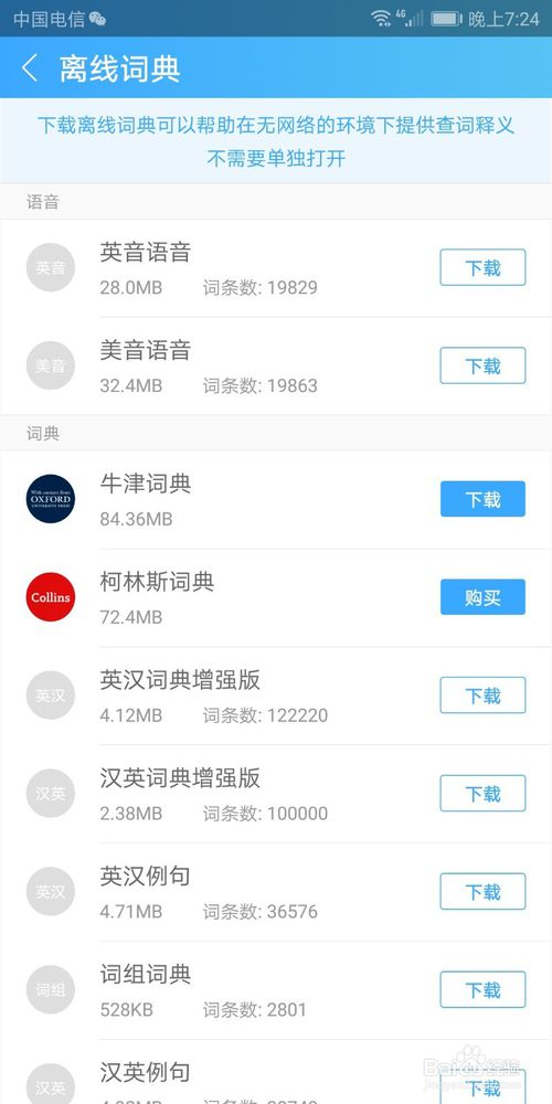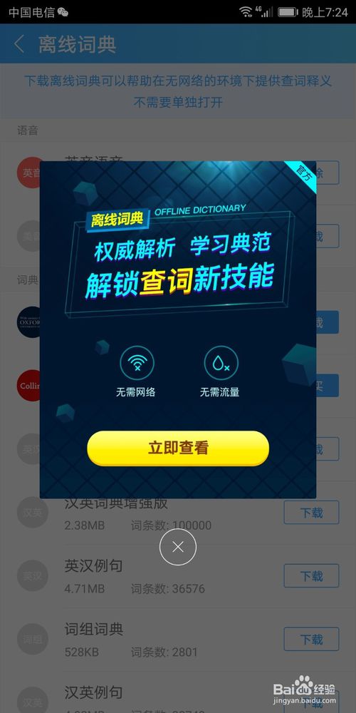 6.登陸完畢之后,我們退出去,就可以下載離線的詞典,有免費(fèi)的,也有付費(fèi)的。根據(jù)自己需要選擇~以后詞典包含的內(nèi)容,就可以離線查詢了~