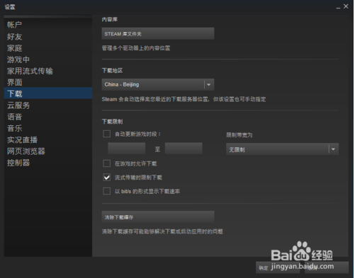1、點擊steam窗口左上角的Steam - 設(shè)置 - 下載在這里可以內(nèi)容庫(下載目錄)的文件夾位置,以及下載地區(qū)(下載服務(wù)器)。