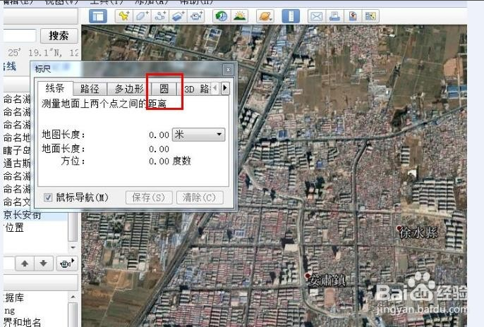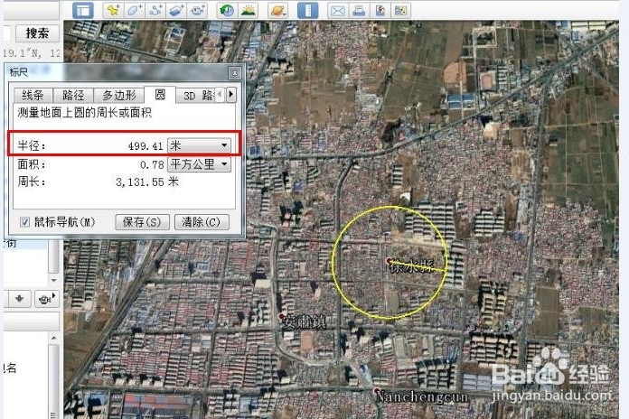 將半徑調(diào)整為米。這時(shí)地球上的鼠標(biāo)會(huì)變成帶有十字線的框框,將十字線的中心對(duì)準(zhǔn)選擇的點(diǎn),點(diǎn)擊一下左鍵,拉開就會(huì)出現(xiàn)一個(gè)圓形,這時(shí)窗口里的半徑就會(huì)有長(zhǎng)度顯示。拉到我們需要的長(zhǎng)度為止,比如我們現(xiàn)在要求的是500米。