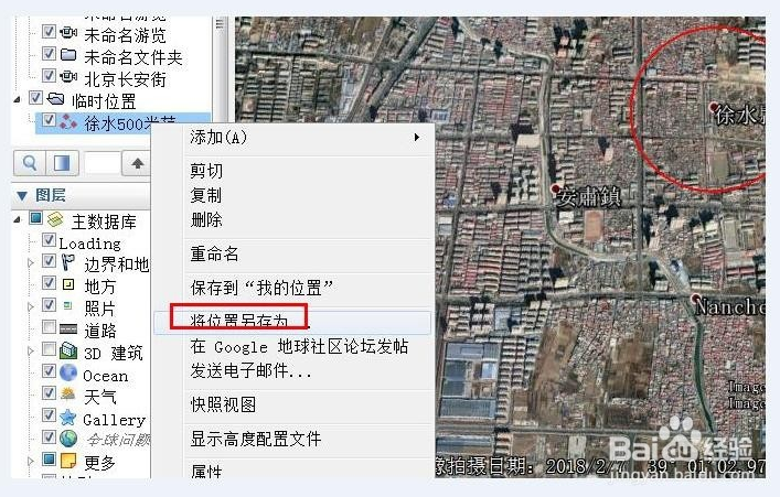 這時(shí)在地球的左側(cè)欄就會(huì)出現(xiàn)我們保存的文件名字。左鍵單擊保存的文件,在下拉菜單中選擇“將位置另存為”。在出現(xiàn)本地的文件中點(diǎn)擊“保存”
