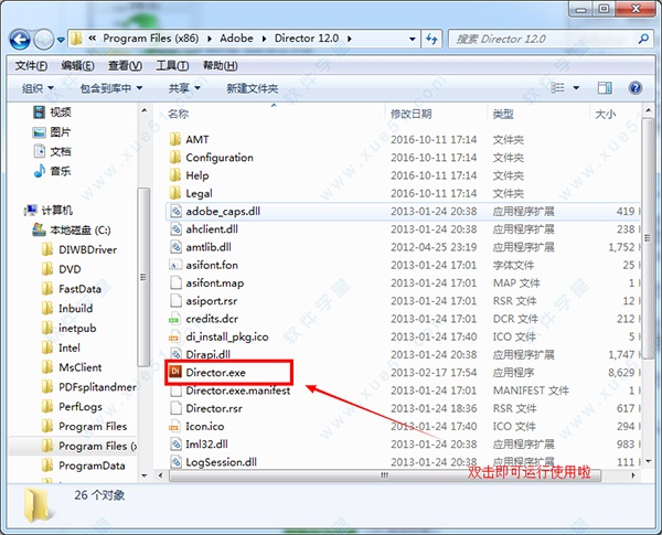 4、最后我們?cè)谀夸洝癈:\Program Files (x86)\Adobe”中找到我們剛剛放進(jìn)去的Director 12.0文件夾,打開(kāi)找到Director.exe程序雙擊即可運(yùn)行;