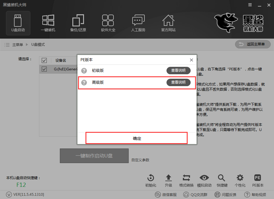 第四步:選擇PE版本。黑鯊裝機(jī)大師的PE版本有兩種,一種是適合日常維護(hù)電腦的初級(jí)版,另一種是適合裝機(jī)人員使用的高級(jí)版,小編在此選擇的是高級(jí)版,然后點(diǎn)擊確定。