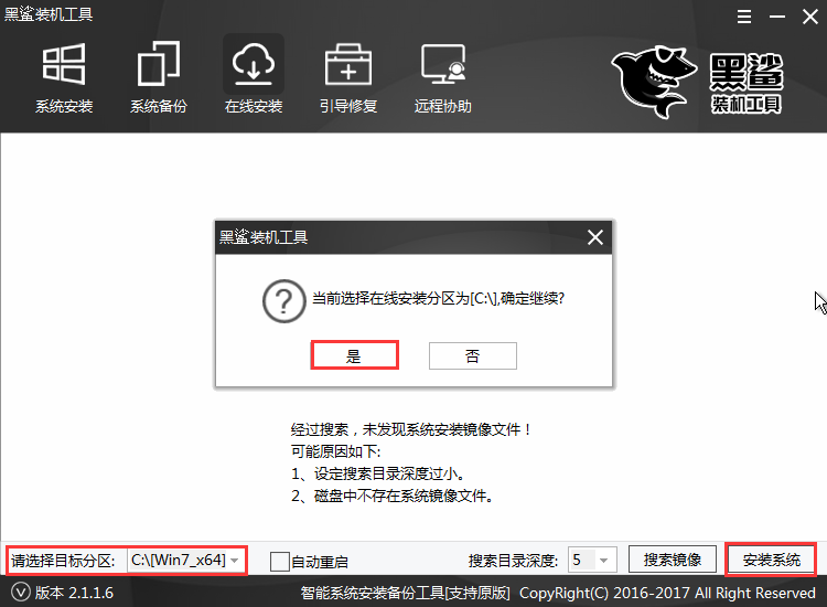 選擇好目標(biāo)分區(qū),點(diǎn)擊“安裝系統(tǒng)”。在彈出的窗口選擇“是”,進(jìn)行Windows系統(tǒng)在線下載。