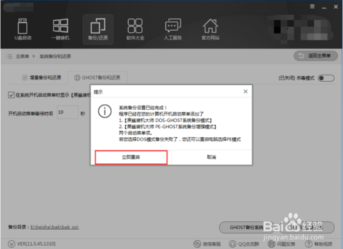 當(dāng)我們下載和備份系統(tǒng)之后我們就可以,這里提醒了在開(kāi)機(jī)啟動(dòng)菜單時(shí)會(huì)出現(xiàn),【黑鯊系統(tǒng)裝機(jī)大師DOS-GHOST系統(tǒng)安裝模式】【黑鯊系統(tǒng)裝機(jī)大師PE-GHOST系統(tǒng)安裝模式】建議你們選擇DOS吧,比較簡(jiǎn)單。點(diǎn)擊立即重啟。