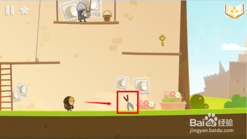 先去拿剪刀,再爬上去把繩子剪斷,那個(gè)士兵站著的架子掉下來(lái),就可以跑過(guò)去得到鑰匙。拿到鑰匙后點(diǎn)擊上方的松鼠,這樣就完成一個(gè)。