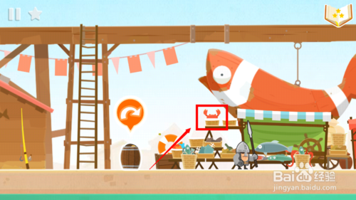 我們先點(diǎn)擊藏身處上方的螃蟹,他掉下來(lái)后把他拿走,不要讓門(mén)衛(wèi)看到喔!