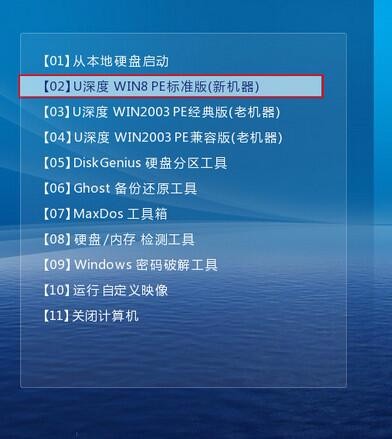 1、將u深度u盤啟動(dòng)盤連接至電腦,重啟等待出現(xiàn)開機(jī)畫面按下啟動(dòng)快捷鍵進(jìn)入到啟動(dòng)項(xiàng)選擇窗口,選取【02】U深度WIN8PE標(biāo)準(zhǔn)版(新機(jī)器),按下回車鍵執(zhí)行操作,如圖所示: